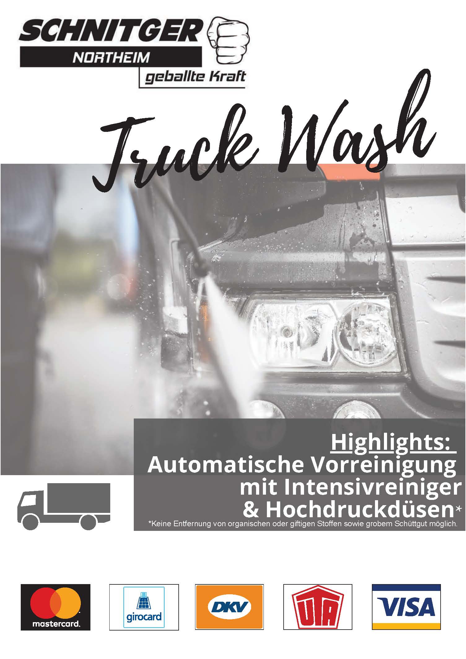 Mit der neuen Nutzfahrzeug-Waschanlange erweitern wir unserer großes Service-Angebot um einen weiteren Punkt. Die Kärcher TB 42 eignet sich für die Außenreinigung von unterschiedlichsten Fahrzeuggrößen. Von Kleintransportern über Busse bis hin zu Sattelzügen und Lastkraftwagen mit Anhänger. Zwei Lichtschrankenpaare sorgen dabei zuverlässig für einen präzisen Waschablauf, somit können verschiedenste Ausführungen (Ladeboard, Spoiler, Spiegelgarten, usw.) sicher erkannt werden.
